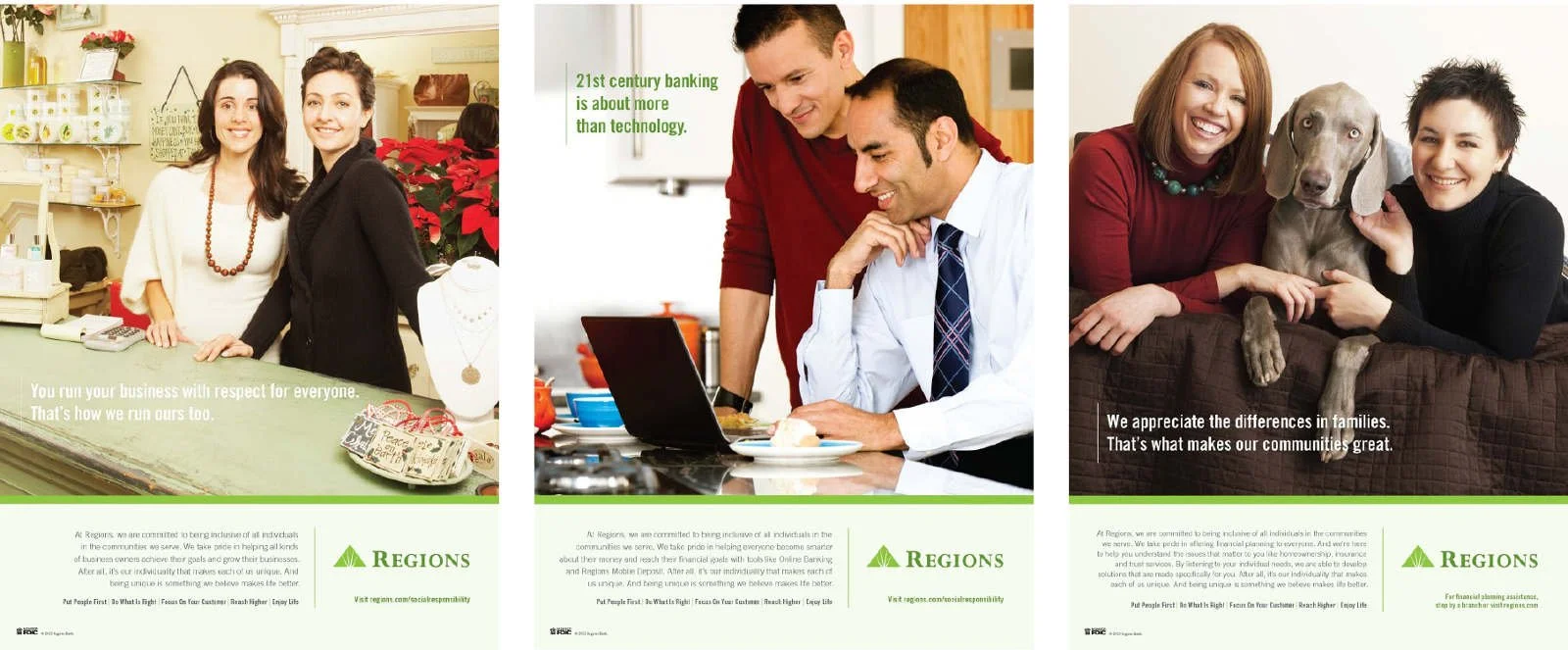 These ads supported Regions' Corporate Social Responsibility initiatives, highlighting the bank's investments in communities, financial inclusion, environmental stewardship, and ethical governance. The message was clear: Regions does more than banking.