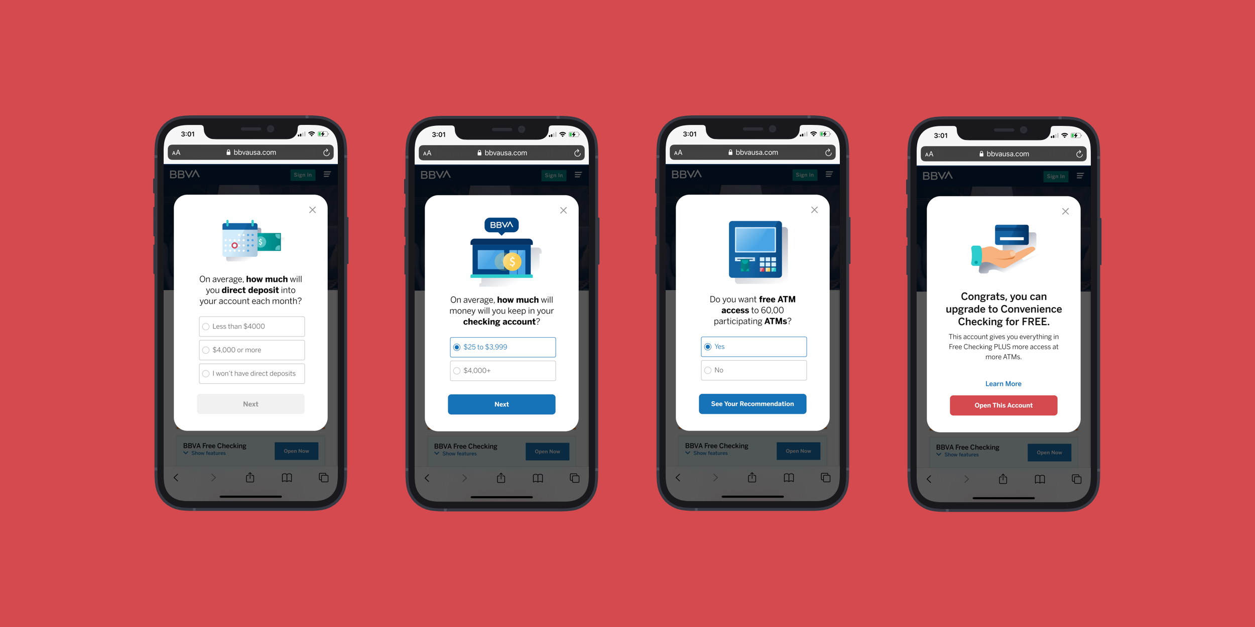 Our marketing team asked us to help our customers choose the account that would best fit their needs. Initially the solution seemed simple; we would show the customer accounts that we have and they would intuitively choose the right one. However, we discovered that most users ignored all other accounts once they saw “free” and immediately signed up for the free checking option, which led to BBVA losing millions of dollars in deposits.
