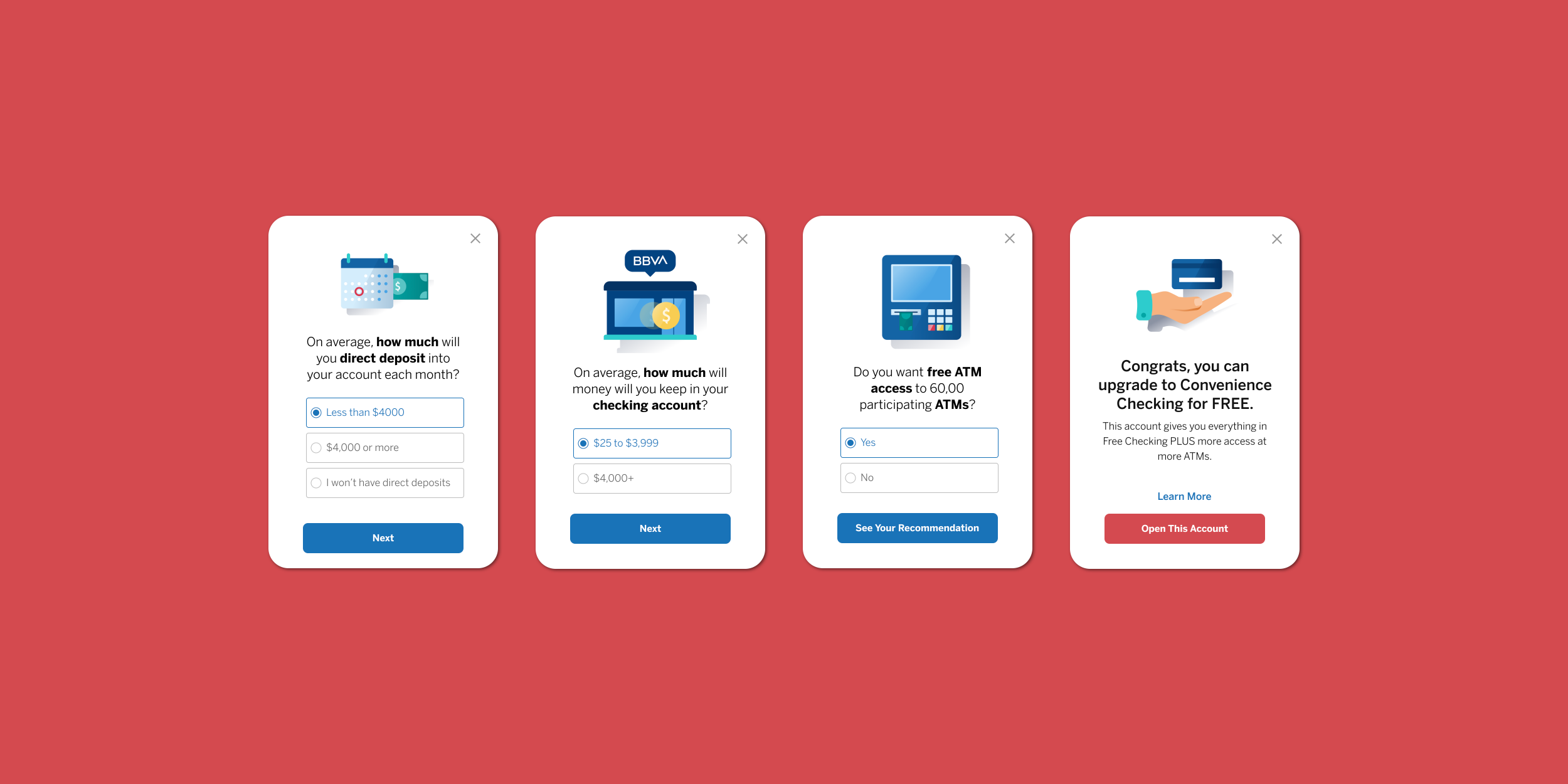 BBVA customers tended to default to our free checking account option, because the label “free” seemed to be the most appealing. However, their lifestyle may have been better suited by a different bank account. Due to the similarities of the bank accounts we offer, this tool was created to help the customer select the bank account that is the most congruent with their lifestyle.